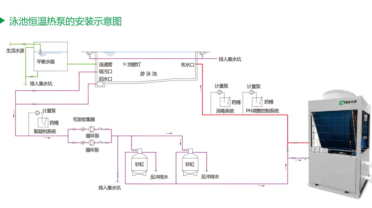 泳池熱泵如此通過制冷劑的不斷循環與泳池池水交換熱量將水加熱,同時在運行中不釋放附加熱能,不排放有害物質,工質與池水完全分開,不會造成二次污染,屬于節能環保產品,故在倡導節能環保的今天,泳池熱泵必將迎來高速的發展。